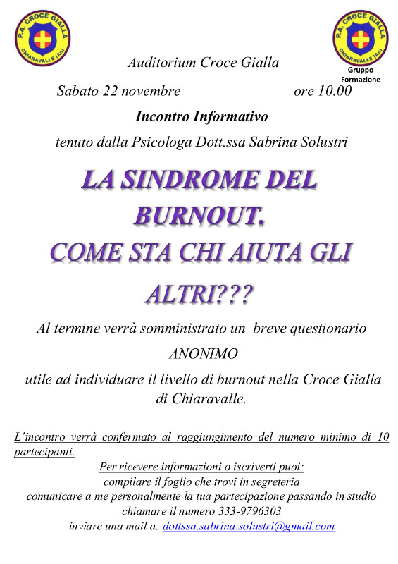 Il Burnout è una sindrome che colpisce maggiormente chi si carica dei problemi altrui. Grazie alla psicologa Solustri Sabrina i Volontari della Croce Gialla di Chiaravalle potranno conoscerne maggiormente gli aspetti.